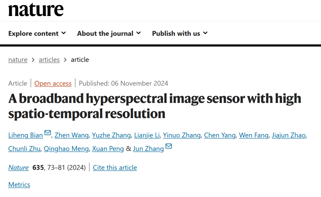 11月7日,北京理工大學(xué)張軍院士團(tuán)隊(duì)首創(chuàng)片上光譜復(fù)用感知架構(gòu),自主研制了國(guó)際首款百通道百萬(wàn)像素、高光譜實(shí)時(shí)成像器件,光能利用率創(chuàng)造世界最高記錄。團(tuán)隊(duì)相關(guān)成果發(fā)表在Nature,文章題為“A broadband hyperspectral image sensor with high spatio-temporal resolution”。論文第一作者為北京理工大學(xué)邊麗蘅教授、博士研究生王振、碩士研究生張宇哲,通訊作者為張軍院士和邊麗蘅教授,北京理工大學(xué)為唯一完成單位。